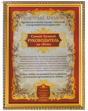 ГлавнаяКаталогКарнавалДипломы. вымпелы. грамоты. наградыДиплом пластик в зол рамке Самый лучший руководитель на свете 23,5*31см 586776