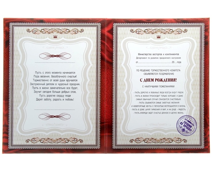 ГлавнаяКаталогКарнавалДипломы. вымпелы. грамоты. наградыДиплом "С Днем Рождения", 20,3 х 26,5 см 1003338