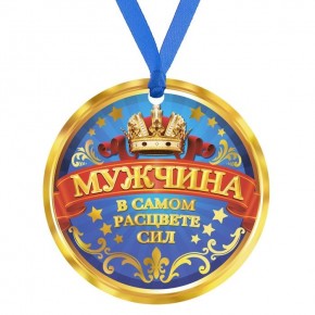ГлавнаяКаталогКарнавалЗначки. медали. ленты. колокольчики. ордена. кубкиМедаль "Мужчина в самом расцвете сил", диам 7,5 см 233808