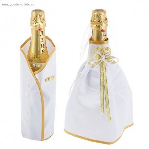 ГлавнаяКаталогСвадебная продукцияСвадебные украшения. рушники.Украшение для шампанского "Фрак", белый с золотым оформлением